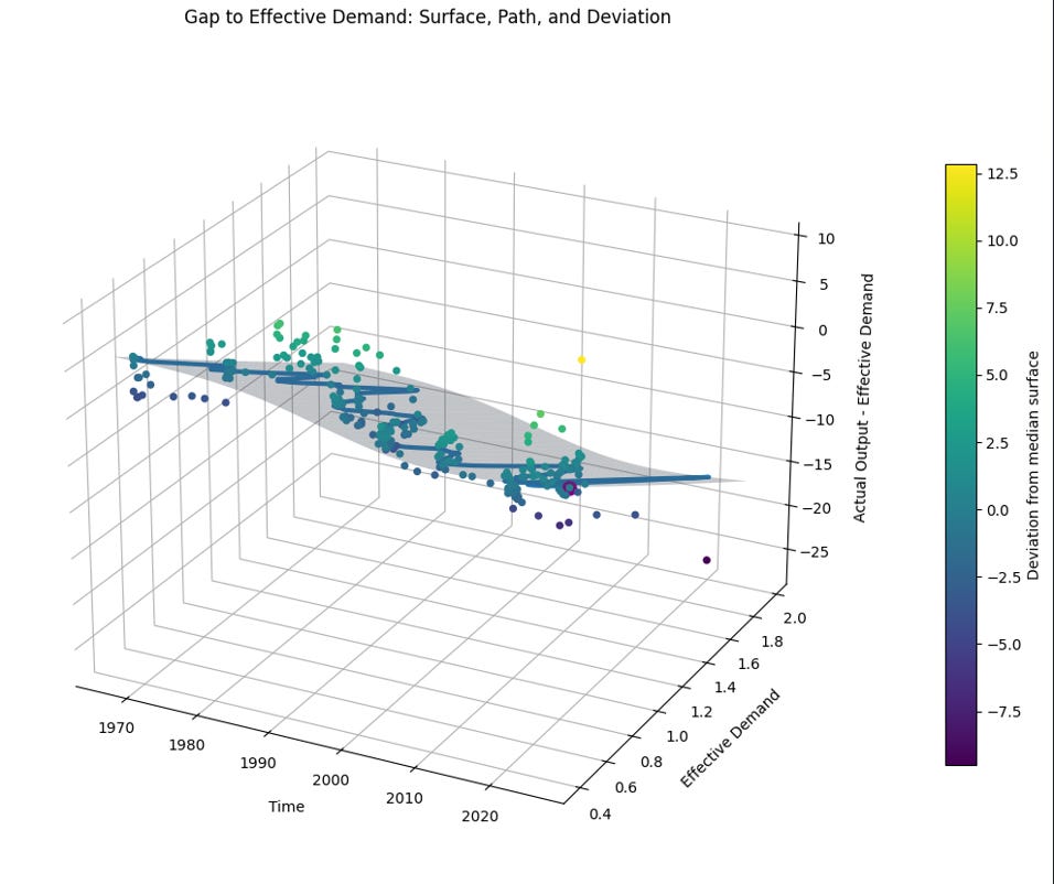 The surface shows how output evolves relative to its effective demand constraint over time. Rather than being fixed, this constraint shifts gradually with underlying structural forces, while tightening as effective demand rises. In other words, stronger demand does not expand capacity indefinitely, it compresses the room for further growth.