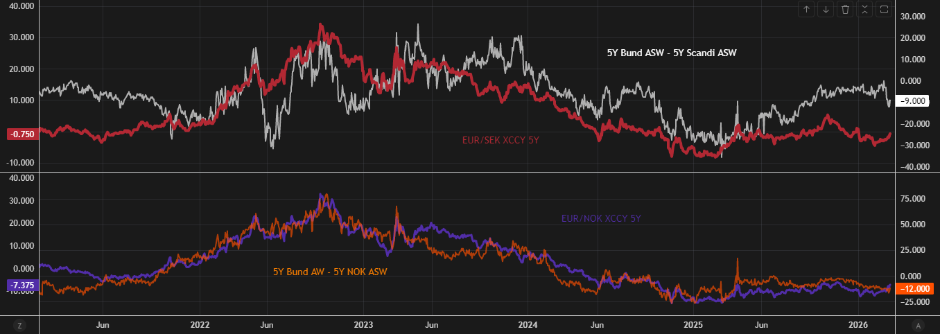 Reverse-NOK issuance continues to dominate, supported by still-depressed basis levels and typical seasonal supply patterns early in the year. Policy divergence is beginning to emerge, with Norges Bank leaning more dovish relative to the ECB, though sticky inflation may delay easing and provide some near-term support. However, Norwegian bonds remain less attractive on a hedged basis versus core European alternatives, limiting inflows and reducing support for further basis tightening.