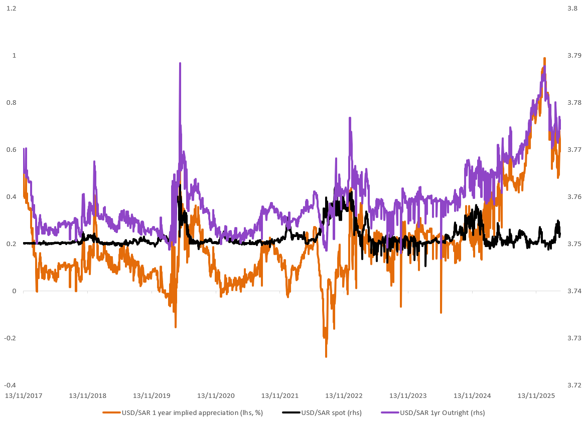 The widening in USD/SAR forwards is less a reflection of deteriorating fundamentals and more a function of convexity pricing under geopolitical uncertainty. With the peg representing a low-volatility regime, any increase in tail risk leads to a disproportionate rise in hedging demand. As a result, forwards embed a risk premium for nonlinear outcomes, even as spot remains anchored and oil prices remain elevated.