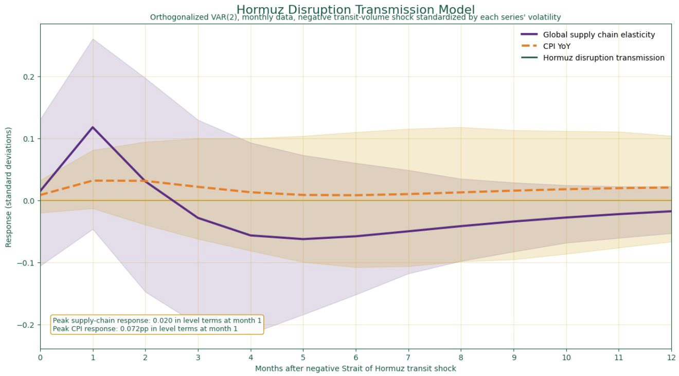 This pattern is consistent with the economic intuition of energy-driven supply shocks. A disruption in the Strait of Hormuz reduces the effective flow of energy and goods through a critical global trade artery. The immediate effect is logistical strain in global shipping and production networks, which manifests as declining supply chain elasticity. As these frictions accumulate, firms face higher transportation costs, longer delivery times, and tighter inventories. These constraints ultimately translate into higher producer costs and rising consumer prices, producing the observed inflation response.