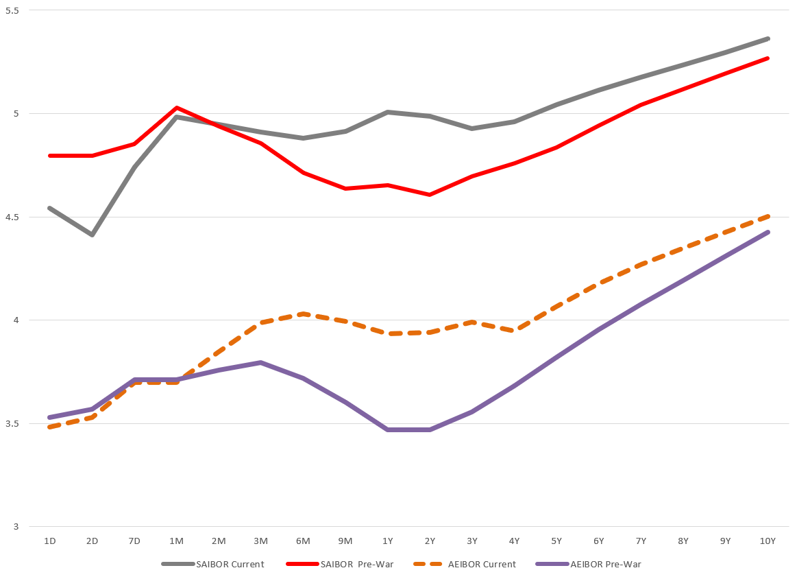 The repricing is no longer confined to the front-end. The upward shift in the long end suggests markets are embedding a more persistent inflation premium across the Gulf, rather than treating this as a purely transitory shock.