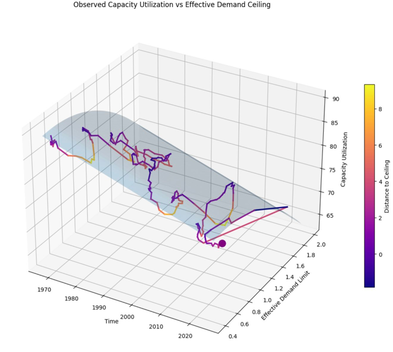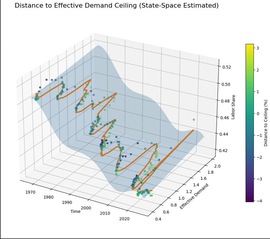This chart reframes the cycle through distance to the effective demand ceiling rather than the level of output itself. The surface represents the evolving constraint, while the colored observations show how far the economy sits from that limit at each point in time.