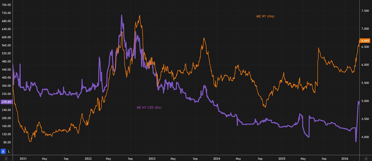 The rise in 5Y high-yield CDS in the Middle East reflects a surge in demand for protection, not just deteriorating fundamentals. In other words, investors are actively pricing tail risk. When uncertainty spikes, CDS becomes the cleanest hedge, so spreads widen even before actual defaults or balance sheet stress materialize.