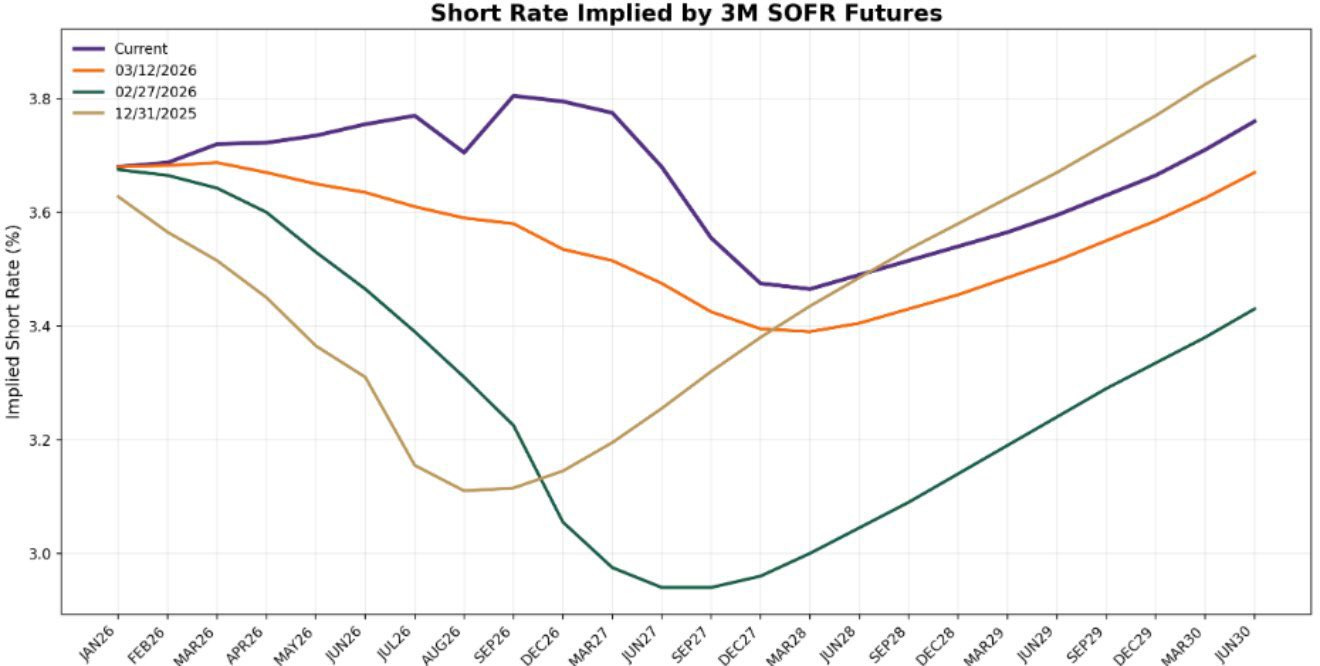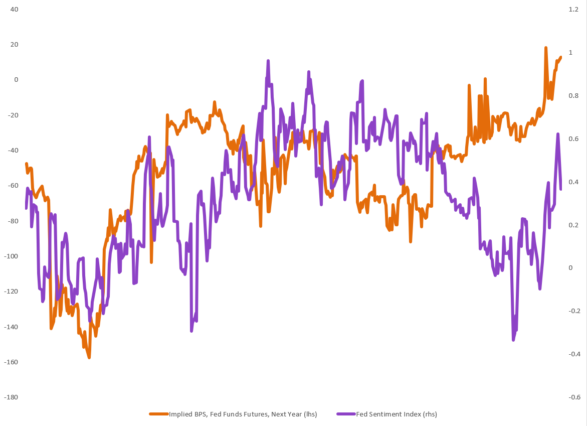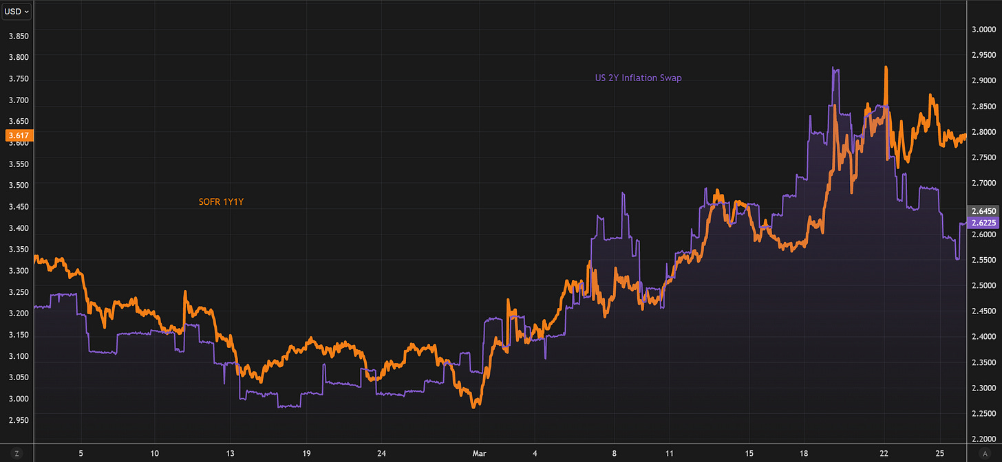 The rise in market-implied inflation expectations (2y inflation swaps) has been a key driver of the repricing in 1y1y SOFR. Against a backdrop of elevated geopolitical risk and a wide dispersion of potential outcomes, markets are likely to oscillate in their assessment of the inflation impulse. That uncertainty will continue to feed directly into policy expectations assuming labor market conditions remain broadly resilient.