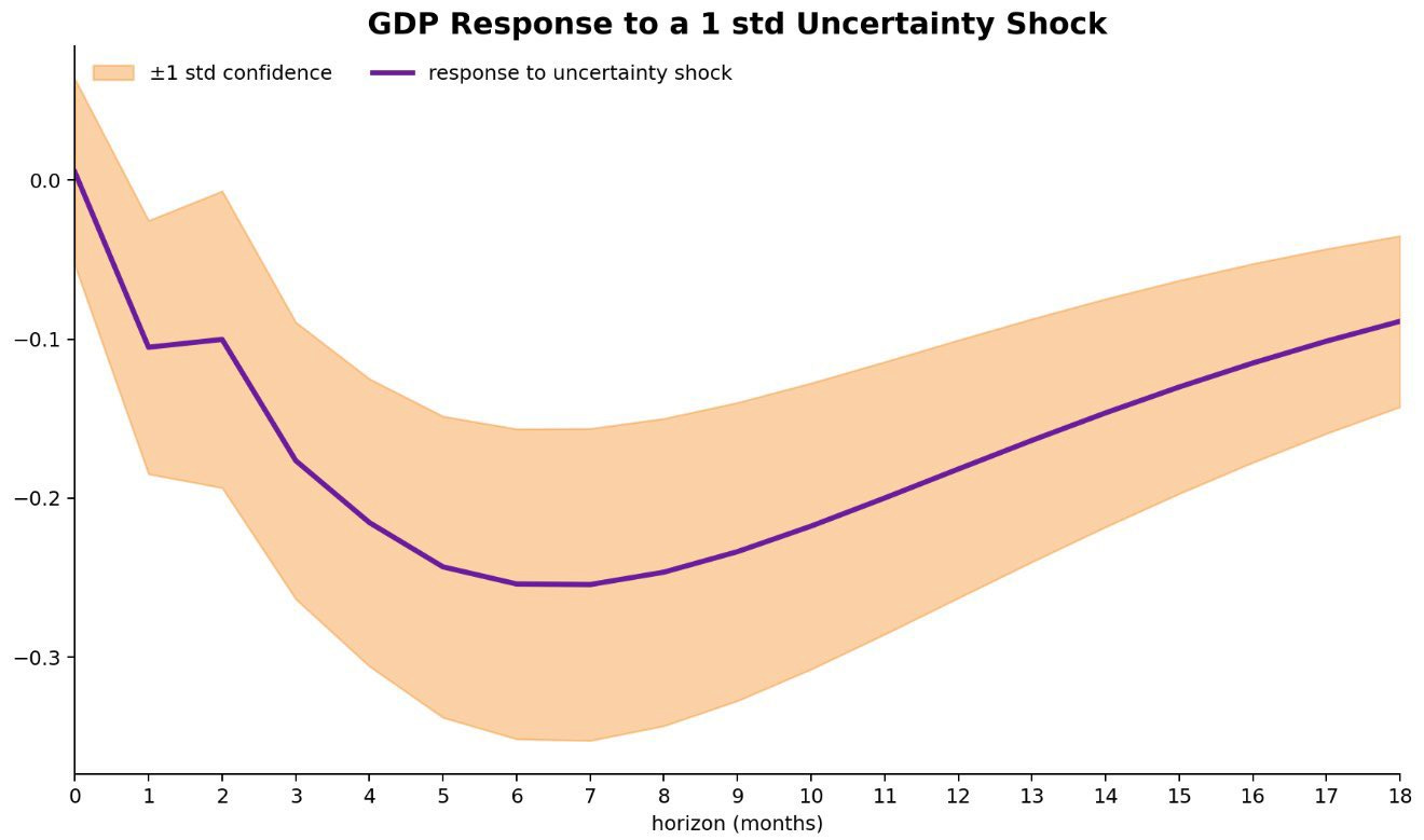 A one standard deviation uncertainty shock induces a persistent decline in real GDP. The contraction intensifies over the first 6–7 months, reaching a trough of approximately -25 basis points, before gradually dissipating. However, output remains below baseline even after 18 months.