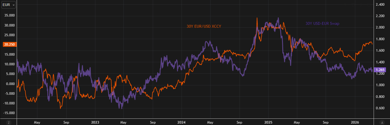 The case for steepening in the EURUSD cross-currency curve remains intact, driven primarily by expected divergence between EUR and USD rates. The view is that EUR rates will lag USD, while the EUR curve steepens more aggressively. Swap spread dynamics reinforce this, with USD spreads supported by structural factors such as deregulation, while EUR spreads face tightening pressure from increased sovereign issuance, particularly out of Germany.