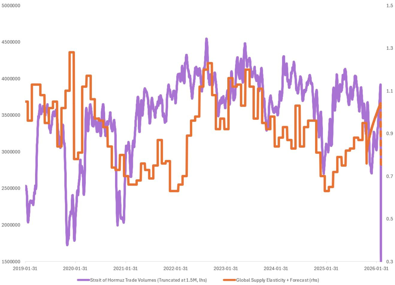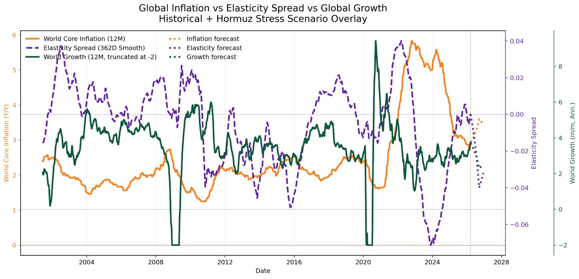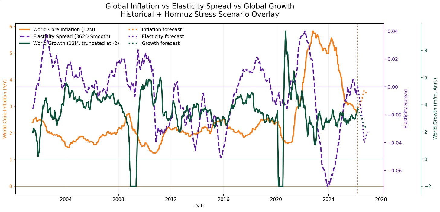 Third, the forward-looking scenario, based on the recent decline in energy transit volumes, suggests a shift toward a more inelastic supply environment. Under this configuration, elasticity moves lower, global growth softens, and inflation remains elevated. The projected path is consistent with a supply-constrained slowdown, rather than a typical demand-driven cycle.