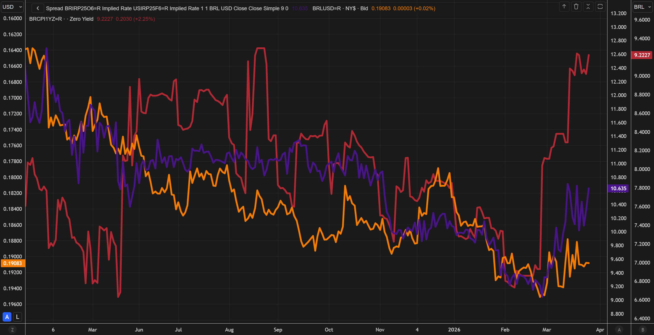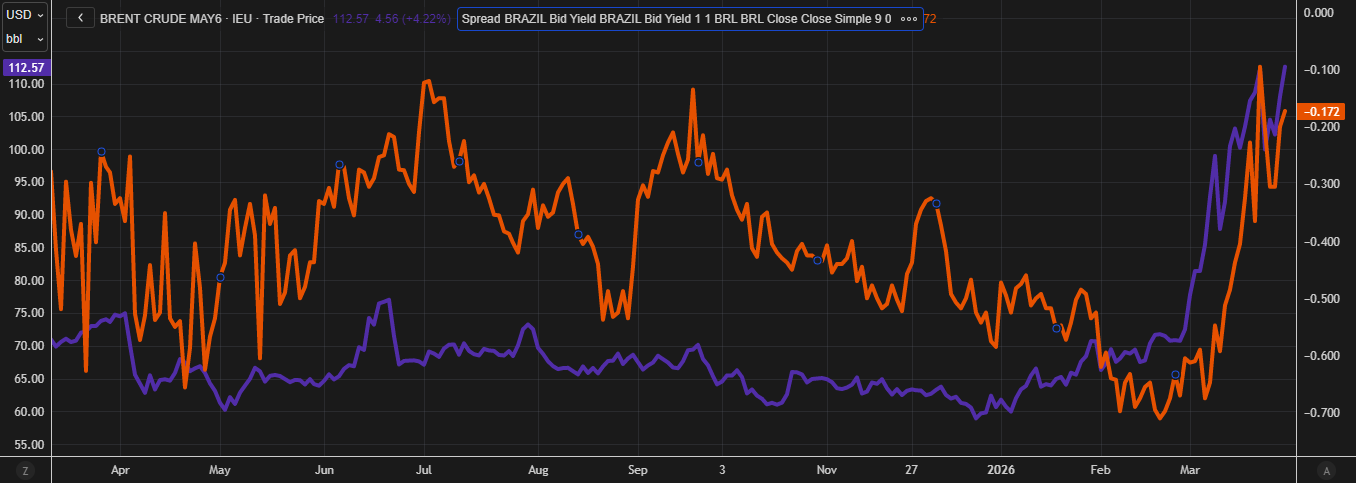 We are now seeing that spread widen as short-term inflation shocks (red line, representing 1-year inflation swaps) have increased significantly. This suggests growing pressure on policy tightening, which could ultimately weigh on the BRL and lead to depreciation against the USD.
