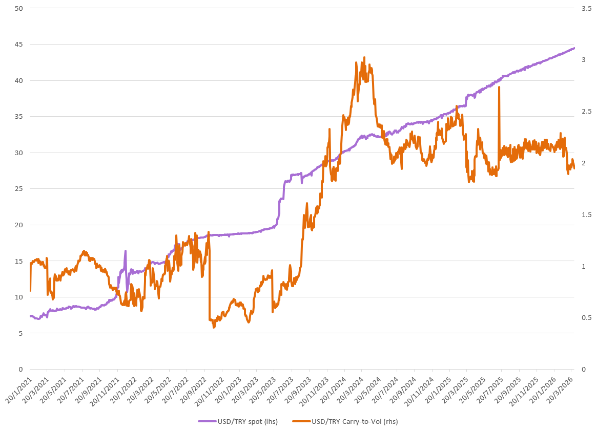 TRY’s headline yield remains elevated, but the compression in carry-to-vol suggests that FX volatility is increasingly offsetting the carry. In a regime of managed depreciation, the trade depends on a smooth adjustment path. As volatility rises relative to yield, the risk of nonlinear FX moves increases, reducing the effectiveness of carry and making returns more fragile. Given this, think carry looks attractive elsewhere.