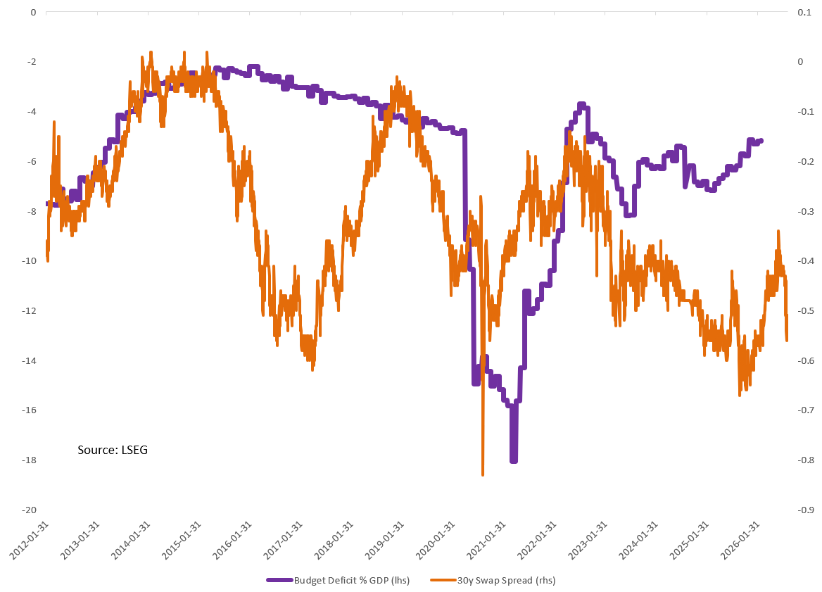 Rising fiscal pressures, particularly from sustained geopolitical conflict and defense spending, could push deficits higher. Historically, worsening fiscal balances have been associated with tighter long-end swap spreads. Current market pricing implies a very large deterioration in fiscal conditions, though potential policy measures could partially offset the impact.