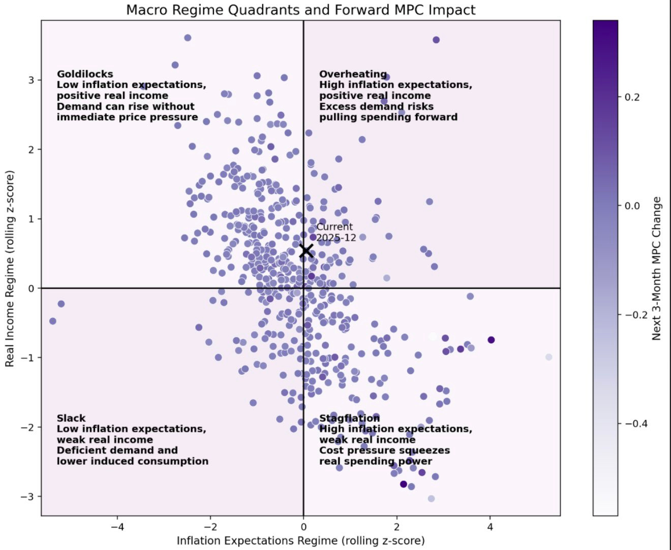 Right now, the economy sits very close to that boundary with a slight overshoot. This suggests the system is operating at its effective demand limit, where further expansion becomes difficult and the balance of risks shifts toward a cooling in activity rather than continued growth.