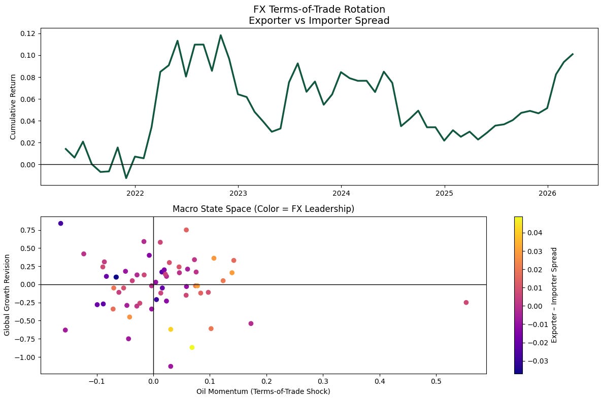 The key takeaway is that FX rotation is fundamentally a joint function, not a univariate story. Oil alone is insufficient. Growth alone is insufficient. It is their interaction that determines leadership.
