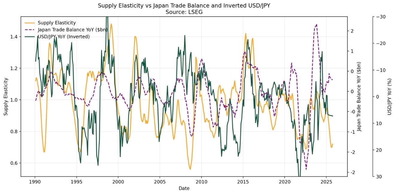 With the current account losing its stabilizing role, fundamentals point to continued depreciation pressure on the JPY unless prices fall or supply elasticity improves.