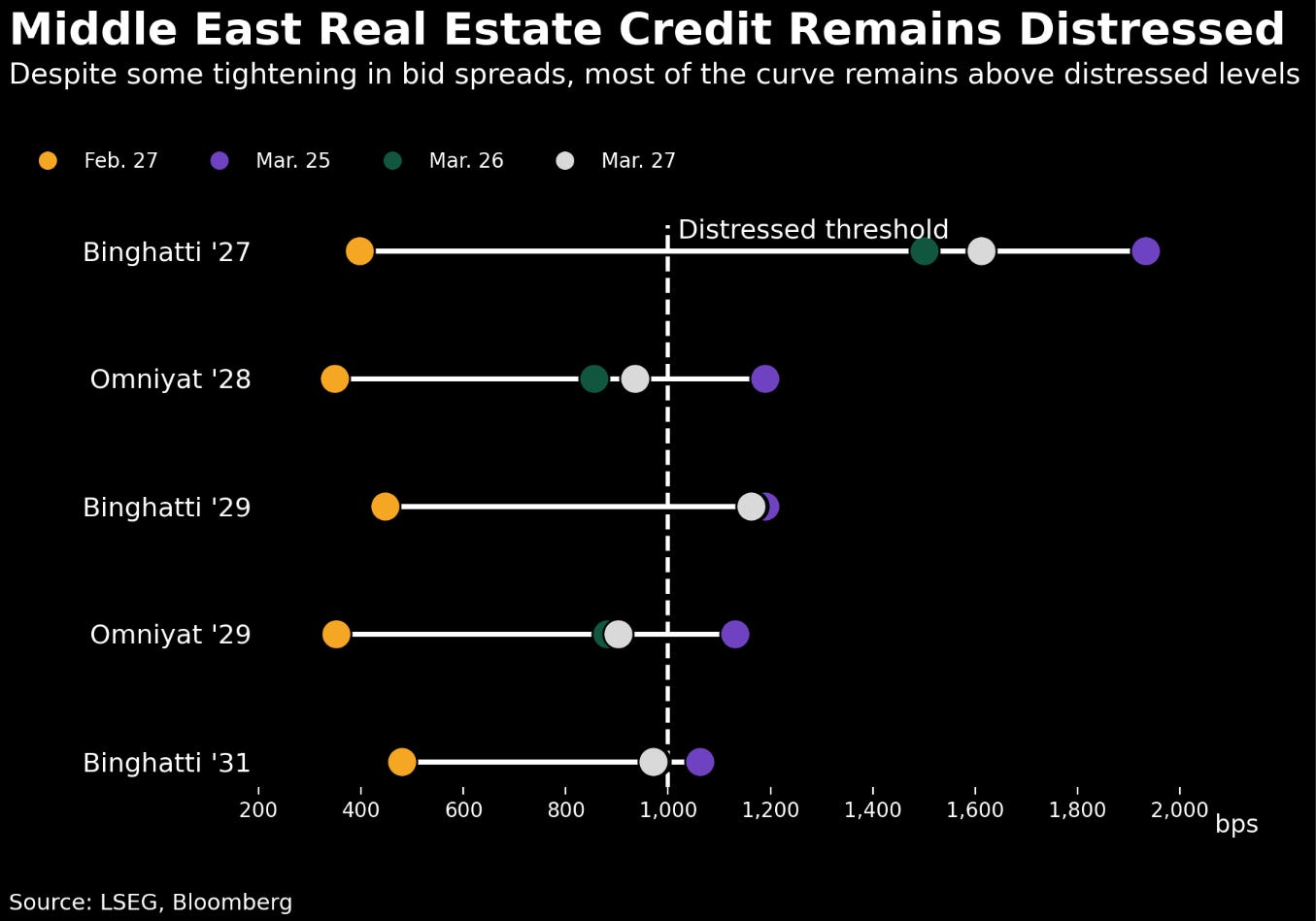 Dubai real estate bonds have come under increasing pressure amid heightened geopolitical tensions in the region. Six dollar-denominated sukuk issued by property firms are currently trading at distressed levels, defined as yield spreads exceeding 1,000 basis points above the risk-free rate, based on data compiled from Bloomberg.