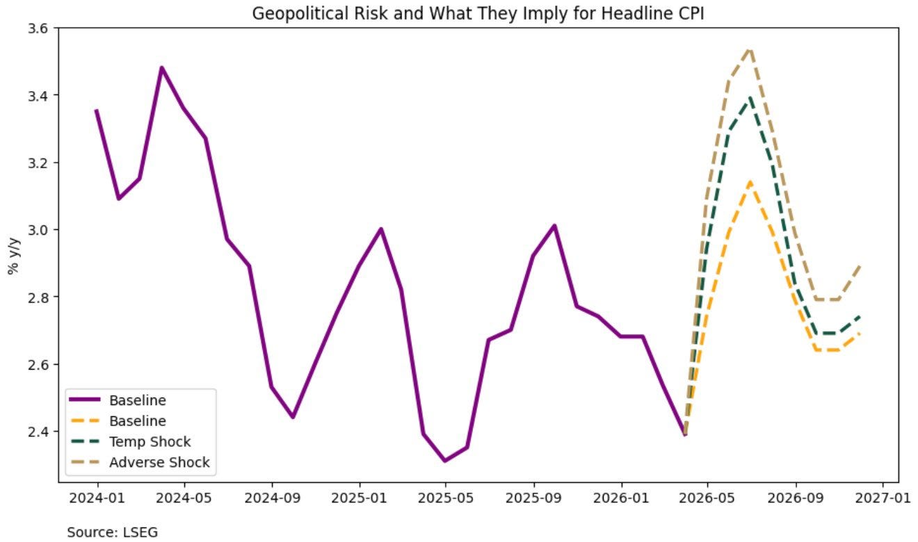 In the baseline scenario, headline CPI is projected to peak at approximately 3.0% in mid-2026 before gradually moderating to around 2.7% by year-end. Under a temporary oil price shock, CPI rises more sharply, reaching roughly 3.4% in the near term, but subsequently declines as energy base effects reverse and pass-through effects dissipate. In contrast, a persistent oil price shock leads to a more sustained inflationary profile, with CPI increasing to approximately 3.5% in mid-2026 and remaining elevated, ending the year near 3.0%, reflecting more durable second-round effects.