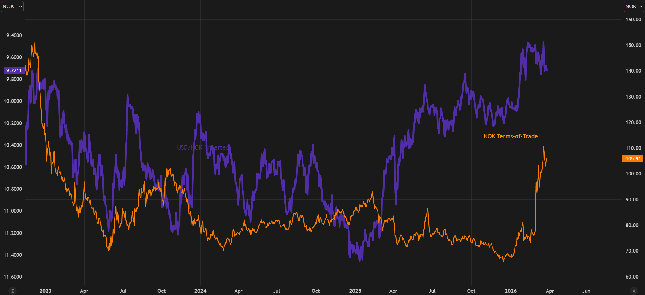 One that I wanted to isolate is USD/NOK which has seen a huge improvement in their terms of trade, essentially allowing for an isolation from the shock faced by the rest of Europe and Asia. This should help to boost real incomes, and support consumption domestically, while potentially lifting growth, and allowing for a somewhat relative cap on inflation.