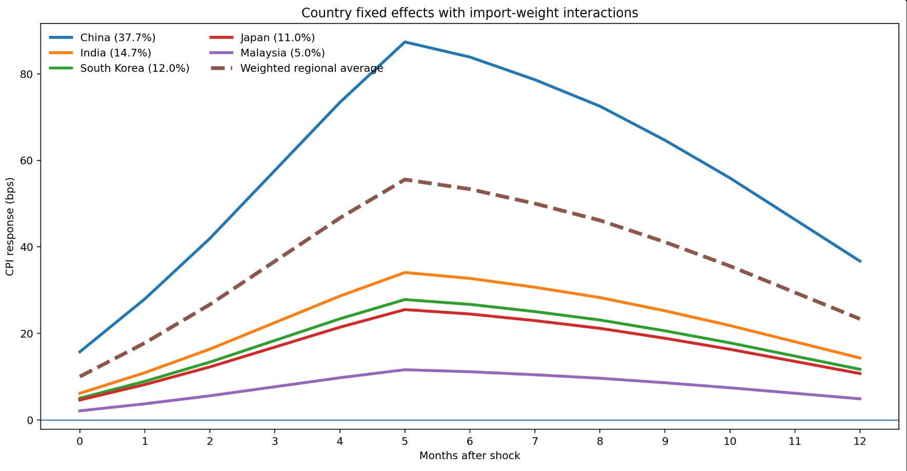 The chart illustrates the dynamic response of inflation across major Asian economies following a common energy supply shock, scaled by import exposure to the Strait of Hormuz. Using a country fixed-effects framework with import-weight interactions, the results highlight both the magnitude and timing of pass-through.